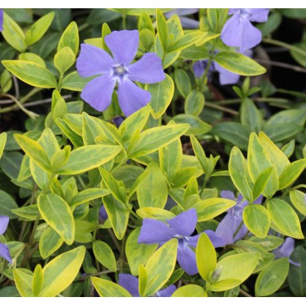 Барвінок Vinca minor дуже яскравий барвінок завдяки кольору листя – насичено салатово-жовто-зелене. Стебла стелиться, довжиною 0,6-1 м, висота 20-30 см. Рослина зимнезелена, тому декоративна протягом усього сезону. Листя яйцевидне, салатово-зелене, з жовто-салатовими розводами, обідком, шкірясте, жорстке, блискуче, менш округле ніж у барвінку великого. Квіти синьо-фіолетові в діаметрі до 2 см, поодинокі, цвіте з травня по червень. Зимостійка рослинка.