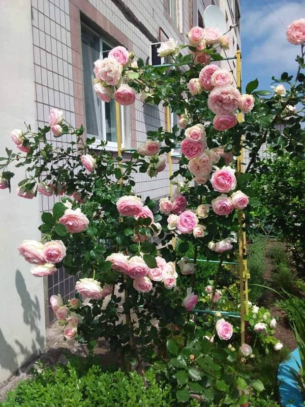 Ця троянда цвіте ніжно – рожевими і густо-густо махровими квітами «теплого відтінку». Забарвлення квітів блідне від центру до країв, крайні пелюстки майже білі. Розмір квітів не дуже великий, близько 10 см, зате вони не никнуть. а гордо дивляться прямо в небо.