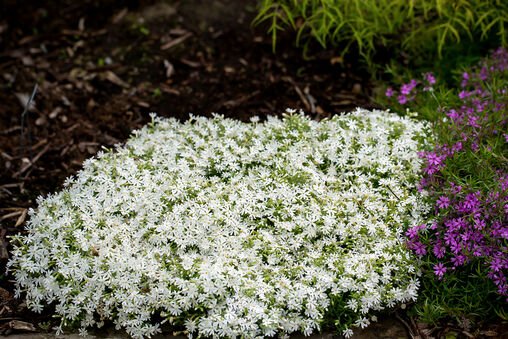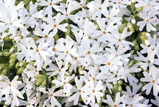 Флокс шилоподібний Сноуфлейк — ґрунтопокривний вид великого і популярного роду Флокс. На відміну від всім звичних високих кущових флоксів з великими суцвіттями запашних квіток, цей вид вирізняється мініатюрними розмірами. Рослина утворює щільну, подушкоподібну форму, у період цвітіння максимальна висота рослини становить 15 сантиметрів, в решту часу знаходиться на висоті 5-10 сантиметрів, в діаметрі розростається до 30 сантиметрів. Назва “флокс шилоподібний” походить від форми його листя. Воно вузьке, загострене і жорстке, досягає в довжину до 5 сантиметрів, густо покриває стебла, на яких є вузли. Пагони сланкі, довжиною близько 20 сантиметрів, у вузлах можуть пускати корінці і вкорінюватися на вологому ґрунті. Таким способом кущі ґрунтопокривного флокса розростаються в ширину, займаючи поступово все більше місця. Період цвітіння у шилоподібного флокса Сноуфлейк проходить з середини травня до середини червня, може цвісти вдруге в кінці літа. Цвітіння флокса шилоподібного настільки рясне, що зелень пагонів і листя ховається під суцільним килимом квіток. Квітки невеликі, досягають в діаметрі не більше 2 сантиметрів, пофарбовані в чистий білий колір, нагадують зірочки, виділяють приємний аромат, зібрані в суцвіття по 5-7 штук або розташовані поодиноко. Пелюстки виїмчасті по краях, на кінці ніби розділяються на дві частини.