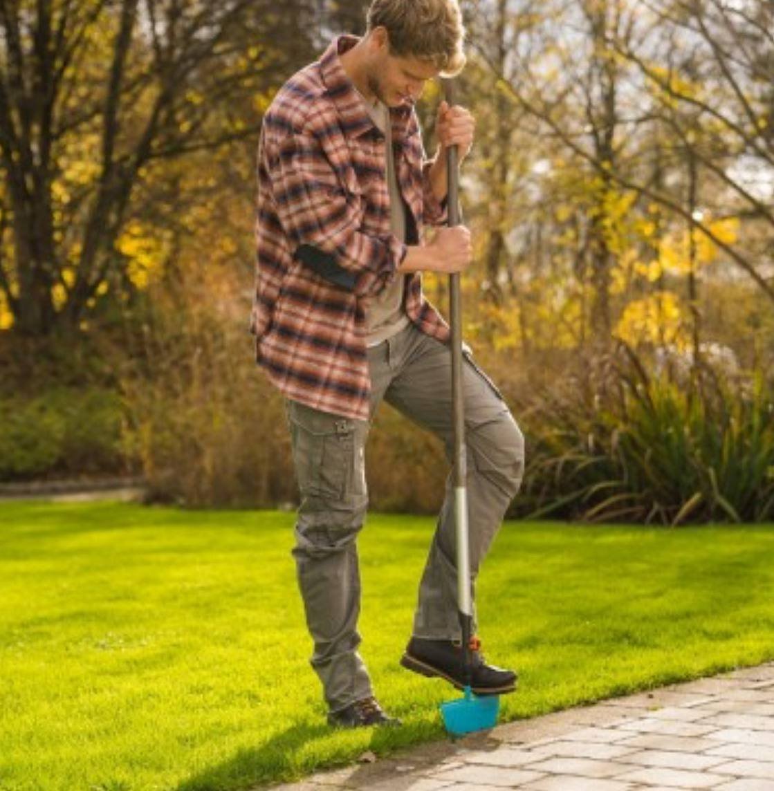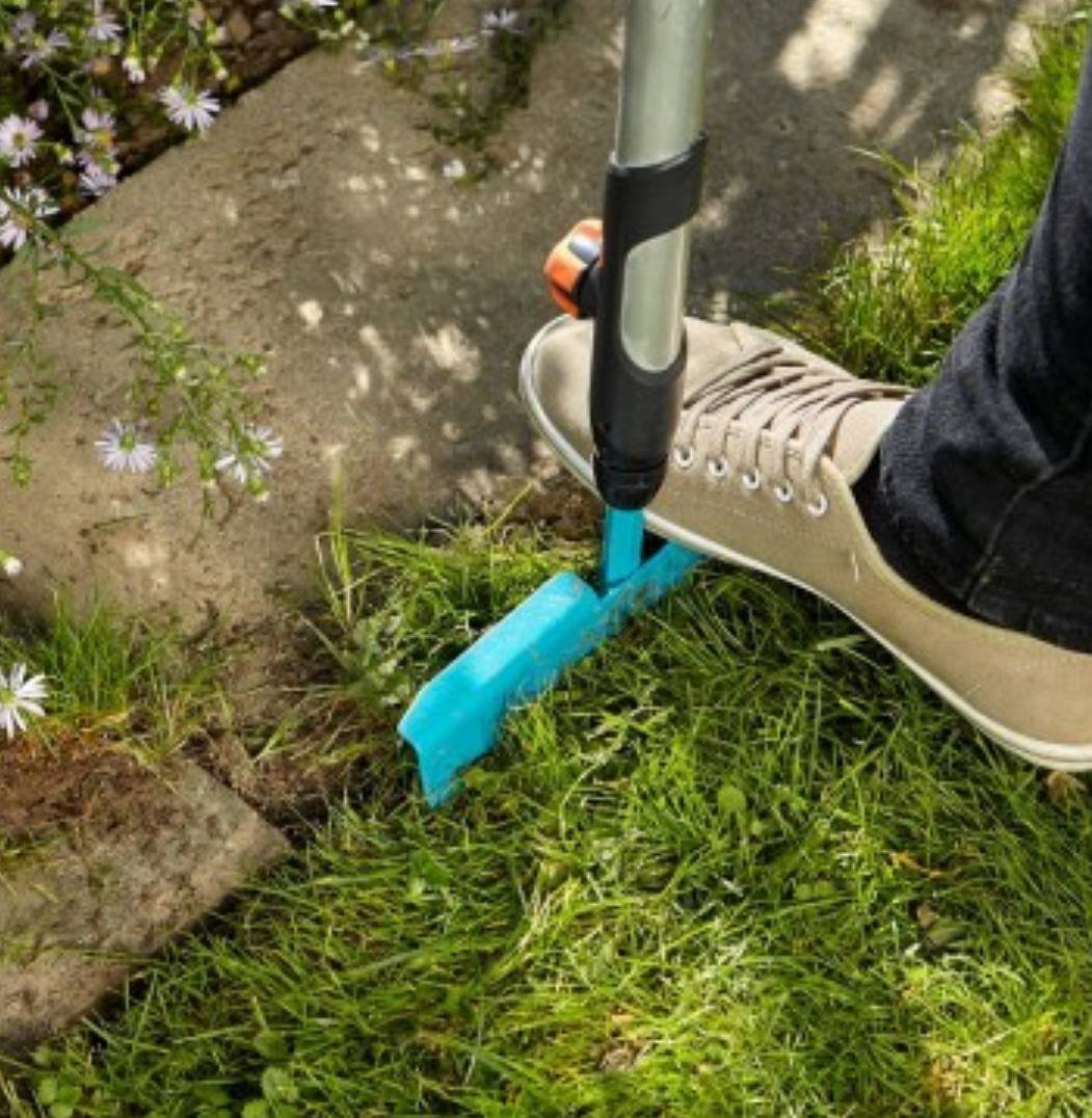 Підрізувач газонних крайок Gardena Combisystem має форму півмісяця, загострену і загартовану сталеву крайку, яка дозволяє легко виконувати відділення або штовхання.