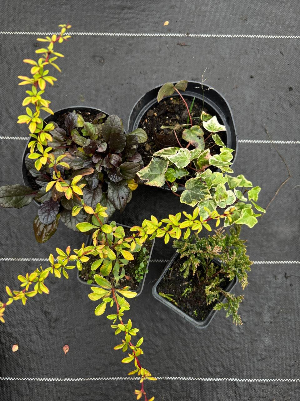 Будьте першим, хто залишив відгук “Набір з 4 рослин: Плющ Вайт Вандер, живучка, барбарис, ялівець”“