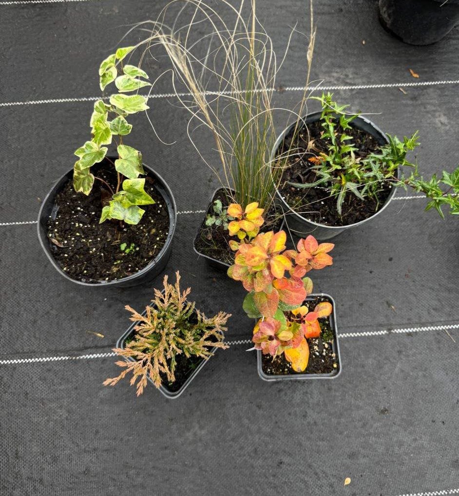 Набір з 5 рослин: Ковила, Ялівець Lime Glow, плющ гостролистий, плющ Вайт Вандер, барбарис Лімончело