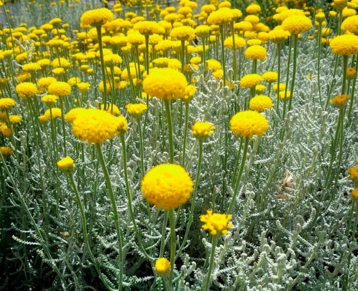 Сантоліна кипарисоподібна  – це вічнозелена рослина родом із Середземномор’я. Незвичайний вид заморської красуні робить її бажаною гостею на садових ділянках та як кімнатну рослину. Вона, без сумніву, стане центром уваги на будь-якій клумбі, альпійській гірці, альпінарії. Сантоліна не висока рослина, що досягають розміру до 60 см. Пагін сантоліни складається з дрібнодисперсних листя, що нагадують гілку кипариса, примітною рисою яких є сріблясте забарвлення. Квіткові бутони – жовтого і бежевого забарвлення, зібрані в щільні кулясті суцвіття до 3 см в діаметрі. Квіти візуально нагадують ґудзики, кнопки, які підносяться на верхівці тонкого стебла. На одній стебловій частині буває лише один бутон, що має пряний аромат. Цвітіння даної культури в умовах відкритого ґрунту спостерігається протягом усього літнього періоду. Завдяки пишному кольору використовують її для оформлення садових клумб, декоративних бордюрів і альпійських гірок. Догляд за вічнозеленим багаторічником під силу навіть садівникам-початківцям. Цей вид відрізняється ажурним, вузьким листям, яке змінює своє забарвлення зі світло-зеленого до сріблястого.
