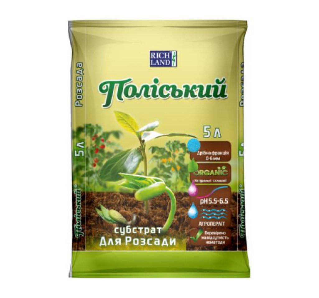 Субстрат “Поліський” — готова спеціальна суміш на основі високоякісного верхового, низинного і перехідного торфу. Його дрібна фракція збільшує площу контакту насіння й коріння із субстратом, це дає змогу розсаді краще проростати та вкорінюватися.