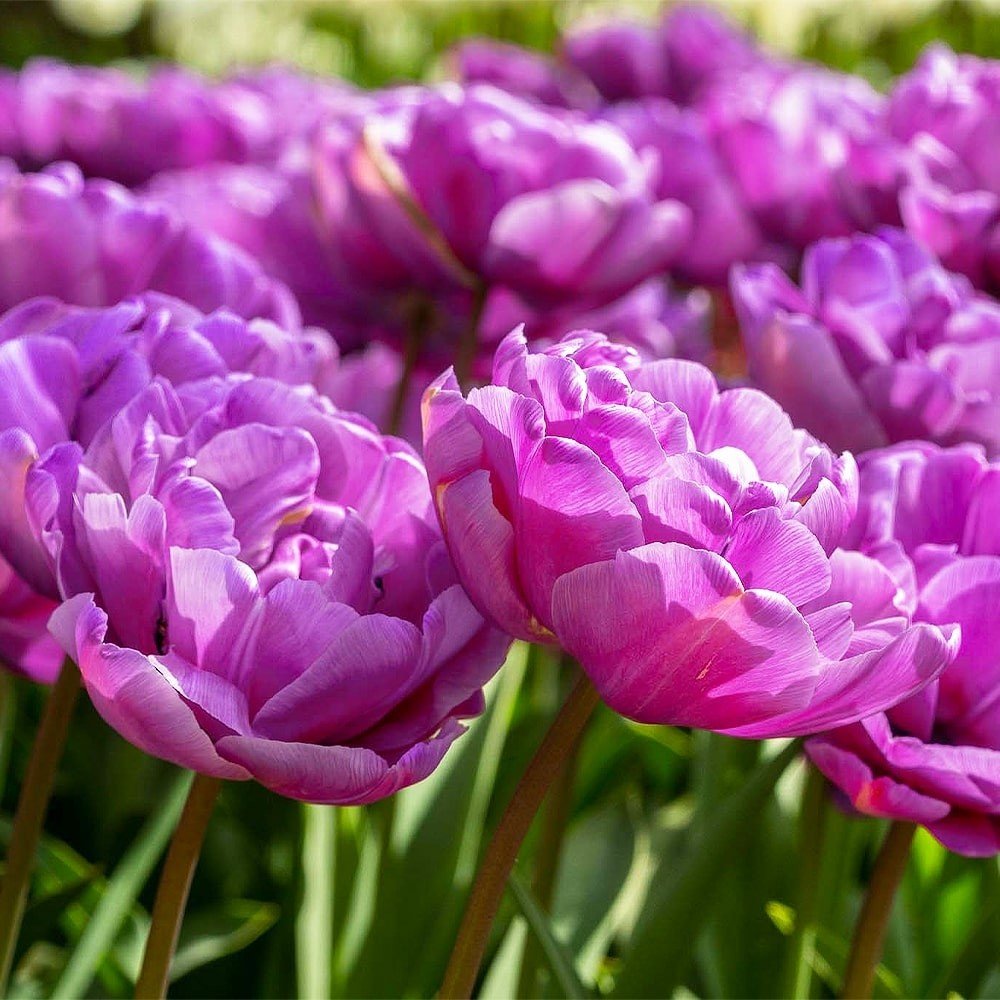 Тюльпан Blue Diamond (Double Late Tulip ‘Blue Diamond’). Один з кращих пізньоквітучих сортів, який відноситься до класу Махрові пізні тюльпани. Розкішний піоновидний тюльпан! Назва сорту перекладається як «Блакитний діамант». Квітки цього тюльпану несправжньо сині (в природі поки не існує синіх тюльпанів), а пурпурово-фіолетові з білим відтінком. Кожна квітка густомахрова: вона складається з 18-20 пелюсток. Квітки підносяться на невисоких міцних стеблах. Це надає рослині особливу чарівність. Висота рослини – 30-50 см. Період цвітіння – травень. Вона вимагає добре освітленого місця з захистом від сильних вітрів. Може рости в півтіні. Для більшого ефекту його краще висаджувати групами. Підходить для прикраси клумб і для вирощування в контейнерах. Цей сорт є відмінним компаньйоном для інших махрових тюльпанів зі світлим забарвленням.