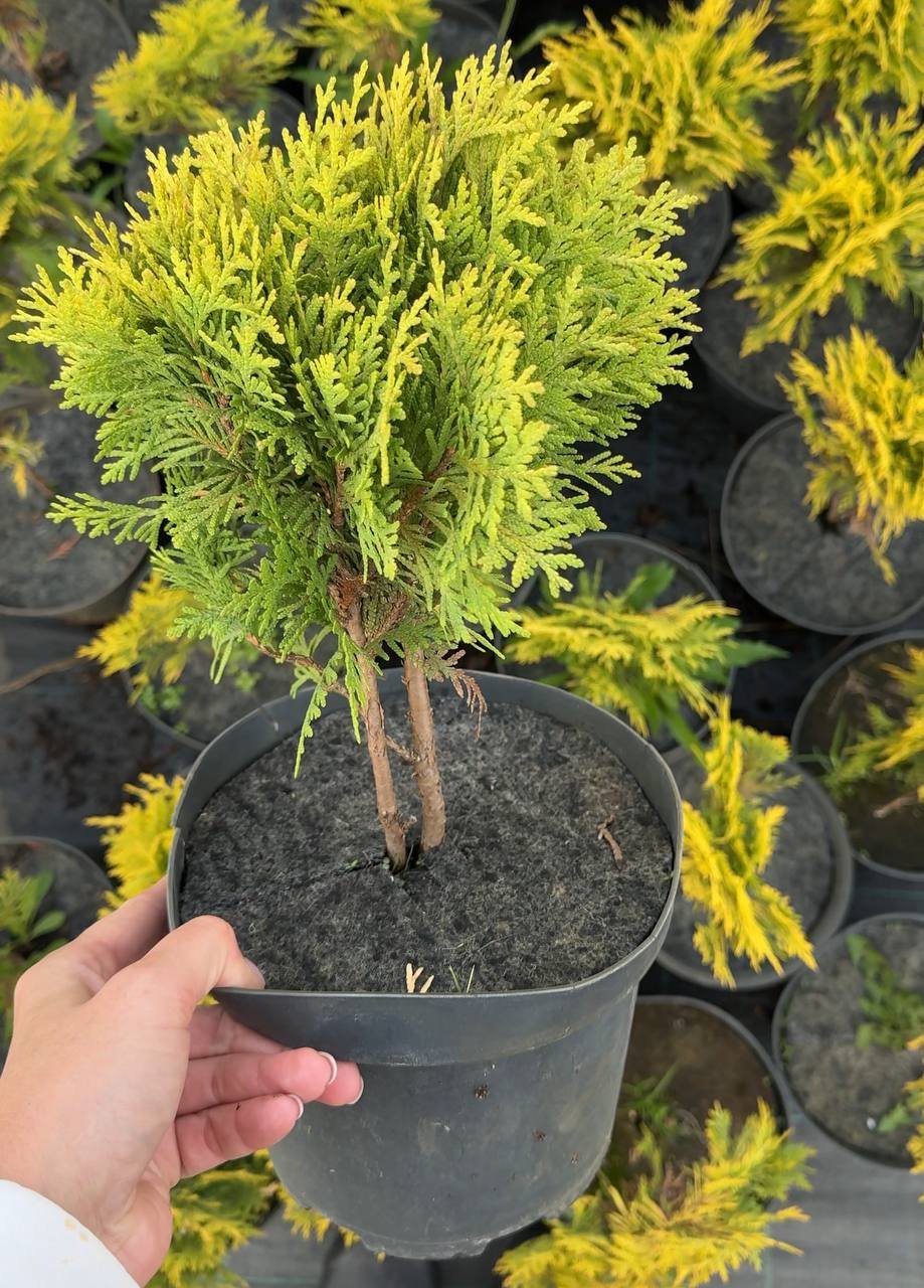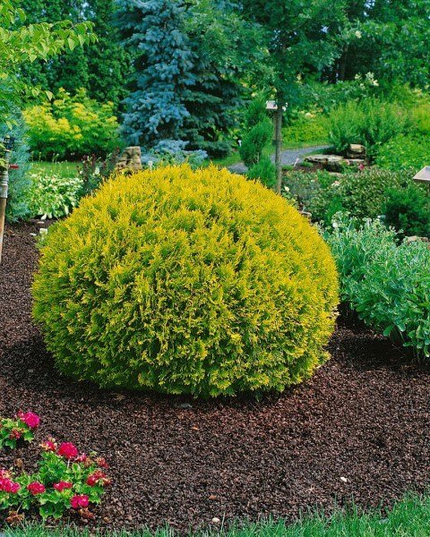 Декоративний карликовий сорт густий з правильною симетричною кулястою формою росту крони і з привабливим золотистим забарвленням хвої. Густа хвоя змінює весняний яскравий жовто-зелений колір на осінньо-зимовий бронзовий.Доросла рослина досягає до 0,8 м у діаметрі. Річний приріст становить до 5-10 см. Нерідко застосовується для оформлення бордюрів та невисоких яскравих живоплотів. Чудово почувається в контейнері та кашпо. Має гарну морозостійкість.