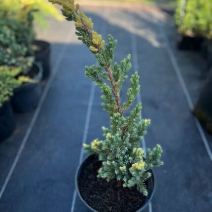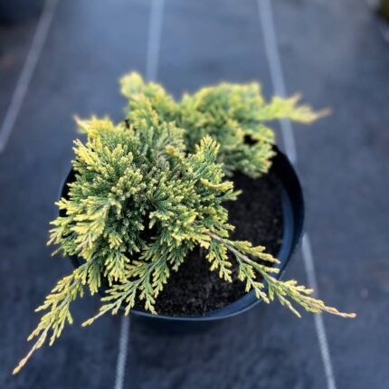 Невеликий (до 30-40 см заввишки), ялівець досягає до 1,5 м завширшки, поширюючись довкола своїми пласкими, “повзучими” пагонами. Росте повільно, пагони, що притиснуті до землі, вкорінюються і отримують додаткове підживлення – саме тому цей ялівець досягає таких великих розмірів в діаметрі. Дрібна луската хвоя має насичений жовто-зелений колір.