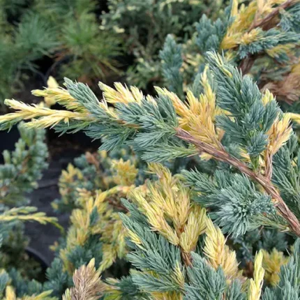 Ялівець сорту Голден Карпет відрізняється високою декоративністю крони, незвичайне забарвлення хвої – причина його використання як контрастна пляма в зелених композиціях.