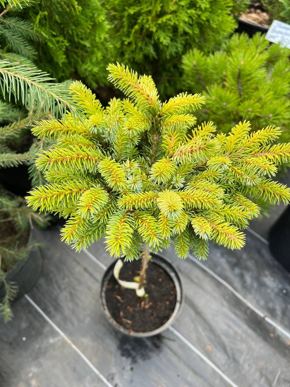 Карликова ялина прищепленого сорту. Декоративна, з правильною симетричною кулястою кроною